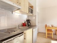Woonkamer met een 2-persoons slaapbank, televisie, eettafel en open keuken met o.a. keramische kookplaat, koelkast, combi-magnetron, koffiezetapparaat, waterkoker, broodrooster en vaatwasser. Verder beschikt dit appartement over een balkon of terras met bergzicht.