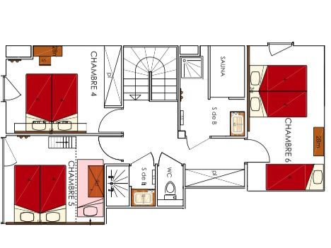 Twee slaapkamers met ieder twee 1-persoonsbedden en twee slaapkamers met ieder een 2-persoonsbed. Eén slaapkamer met drie 1-persoonsbedden. Eén slaapkamer met drie 1-persoonsbedden waarvan één op een mezzanine. Vier badkamers, waarvan drie met douche en één met bad. Drie aparte toiletten. Verder een saunaruimte met douche.