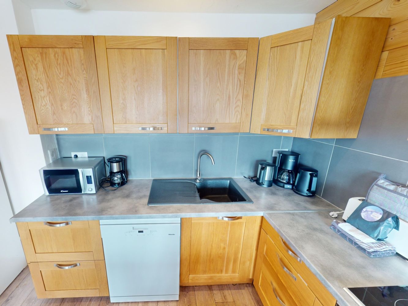 Op de begane grond bevindt zich de lichte woonkamer, die met veel hout is ingericht. De woonkamer is comfortabel ingericht en heeft een fijne zithoek met satelliettelevisie en DVD-speler, een eettafel en een compleet ingerichte open keuken met o.a. een kookplaat, koelkast (met vriesgedeelte), oven, magnetron, vaatwasser, koffiezetapparaat en waterkoker. Verder beschikt dit chalet-appartement over een Wi-Fi internetverbinding en twee balkons met een prachtig vrij uitzicht.