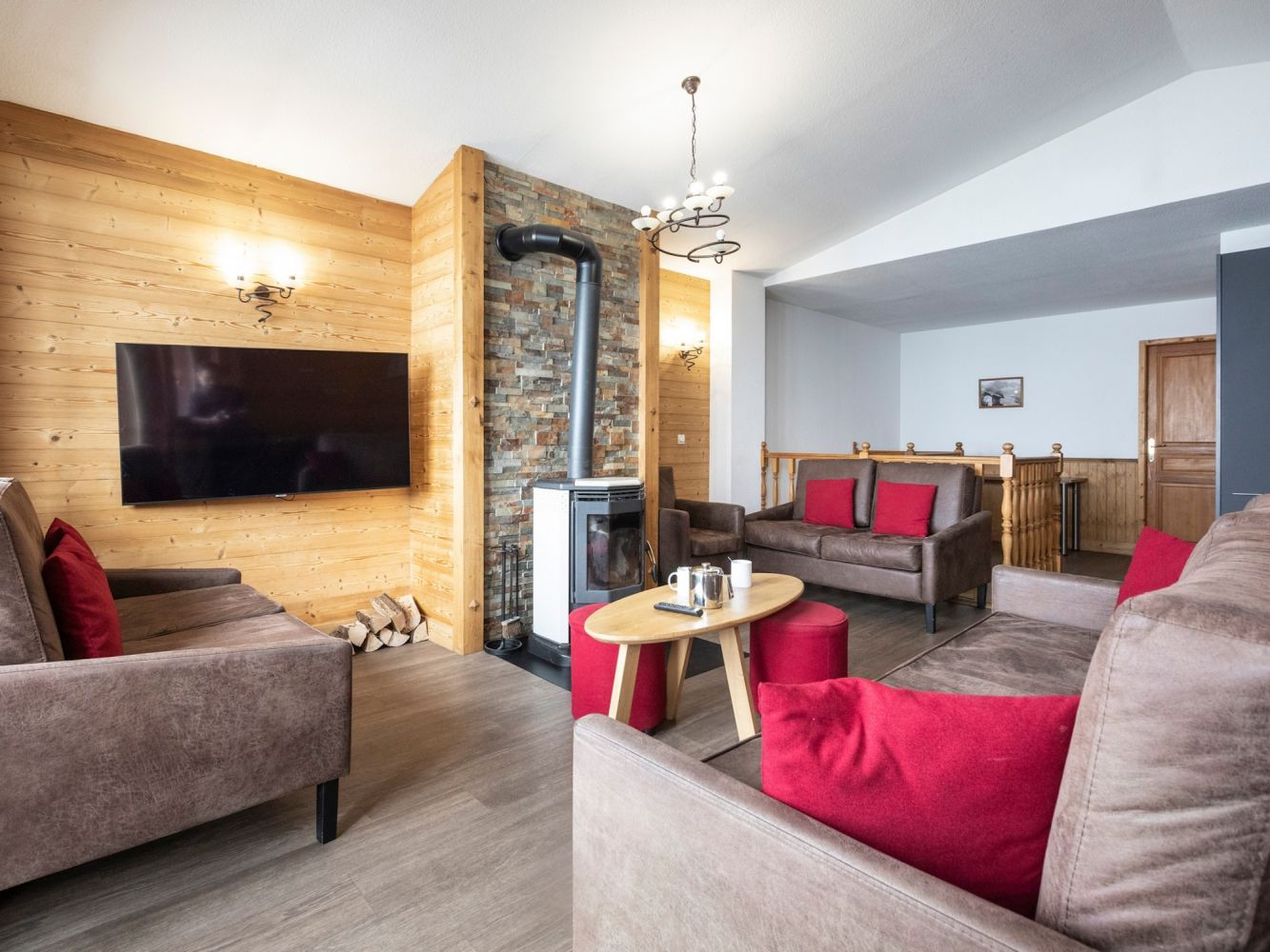 De woonkamer is voorzien van een televisie, houtkachel en een 2-persoonsslaapbank. Compleet ingerichte keuken met o.a. kookplaat, vaatwasser, magnetron, koelkast en eethoek. Balkon.