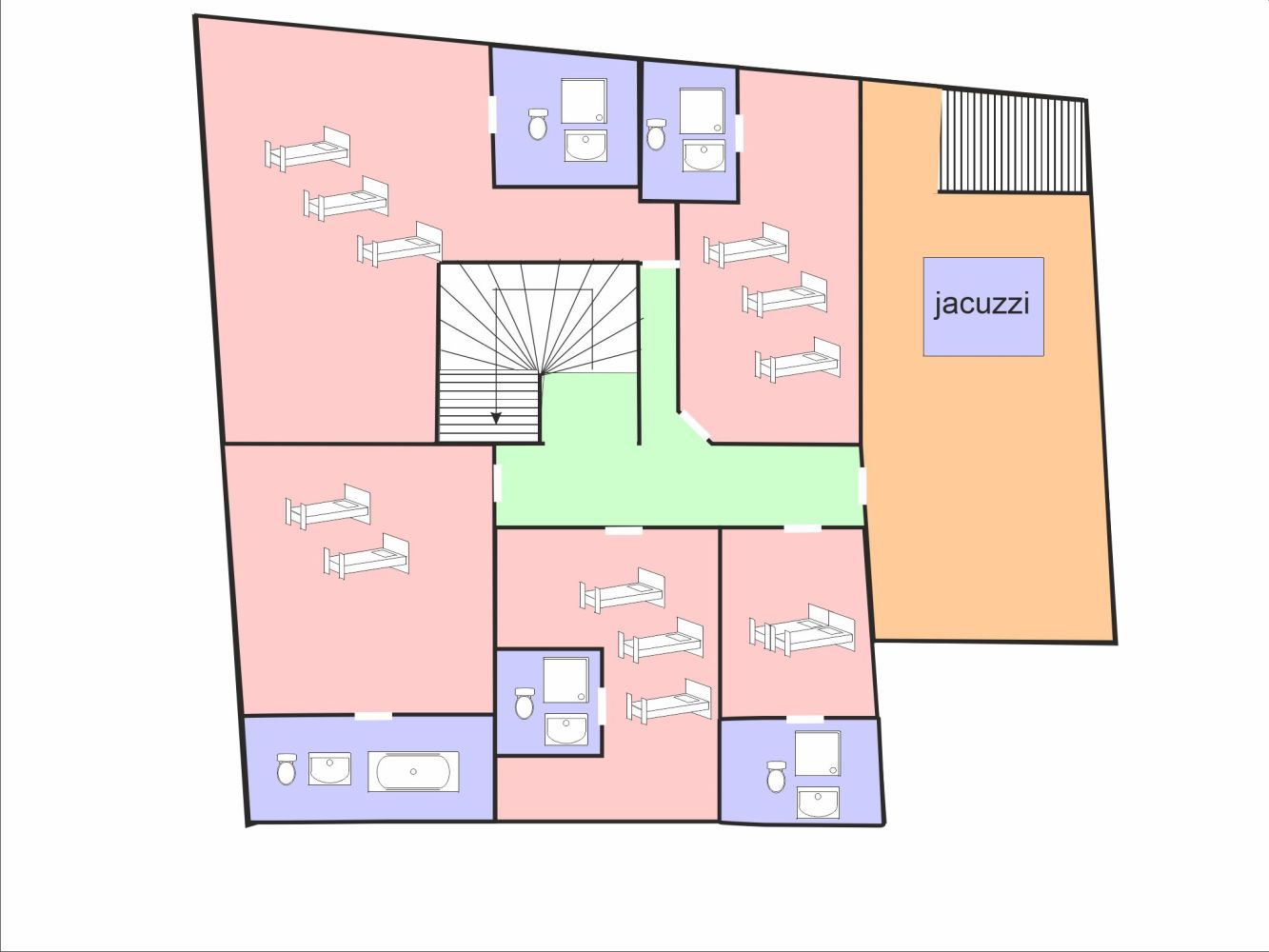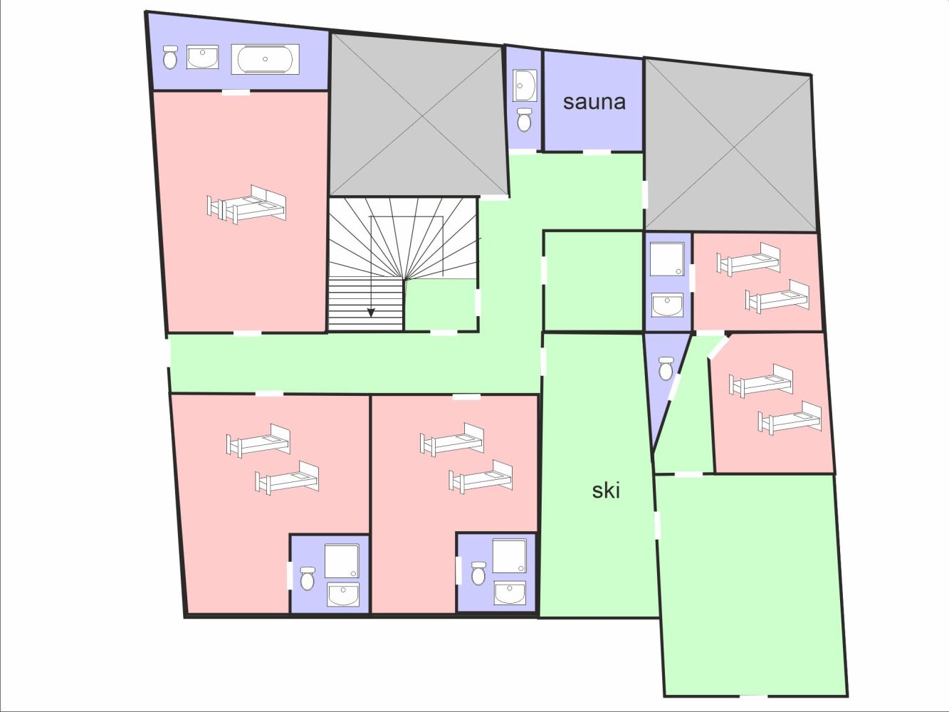 - Vijf slaapkamers met ieder twee 1-persoonsbedden;