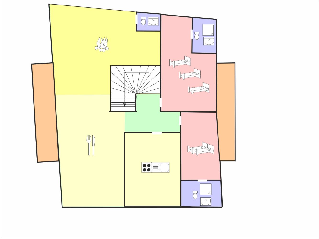 - Vier slaapkamers met ieder drie 1-persoonsbedden;