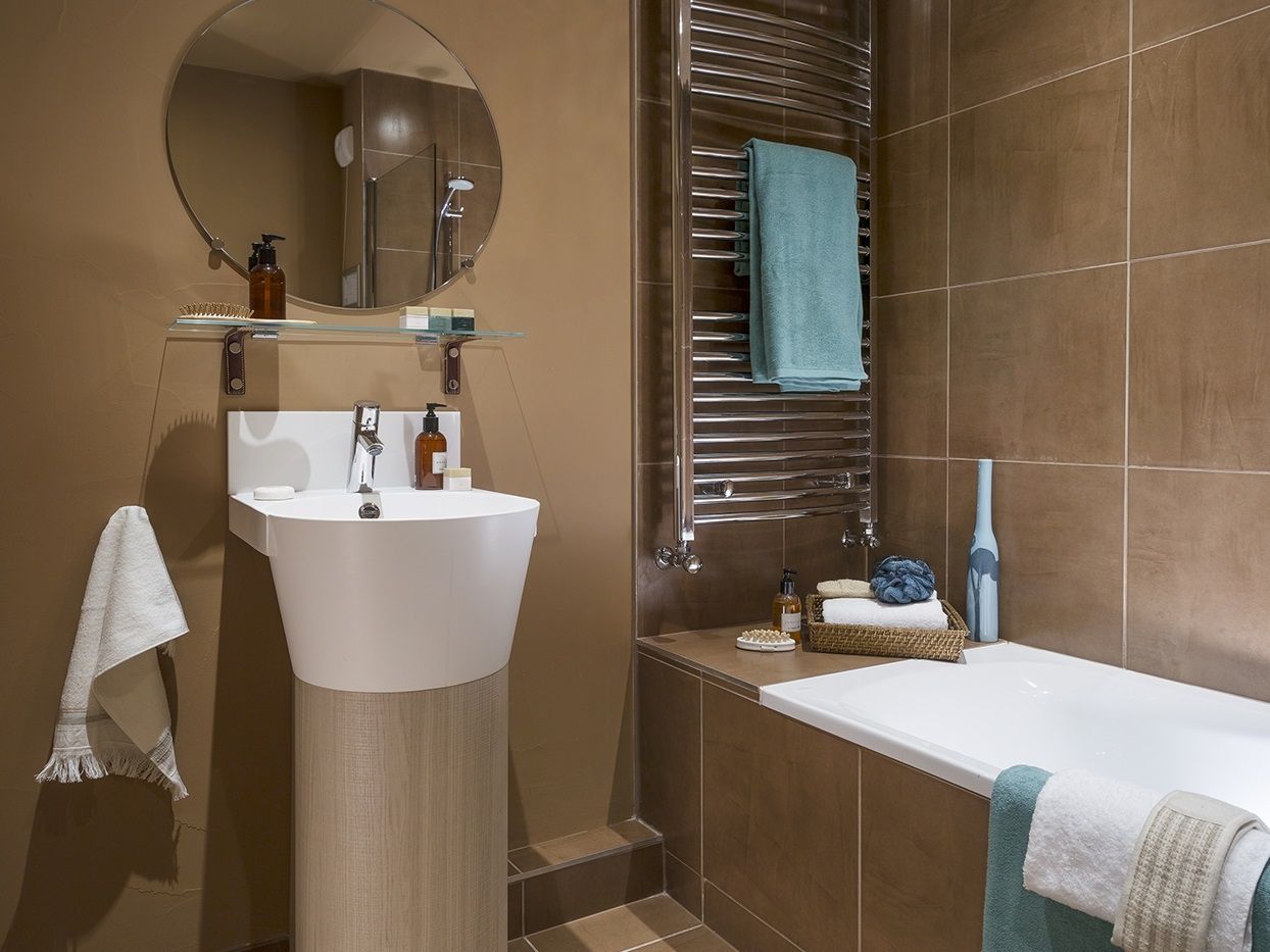 Twee slaapkamers, waarvan één met een 2-persoonsbed. De twee slaapkamer heeft twee 1-persoonsbedden, maar geen raam. Twee badkamers, ieder met bad of douche en toilet.