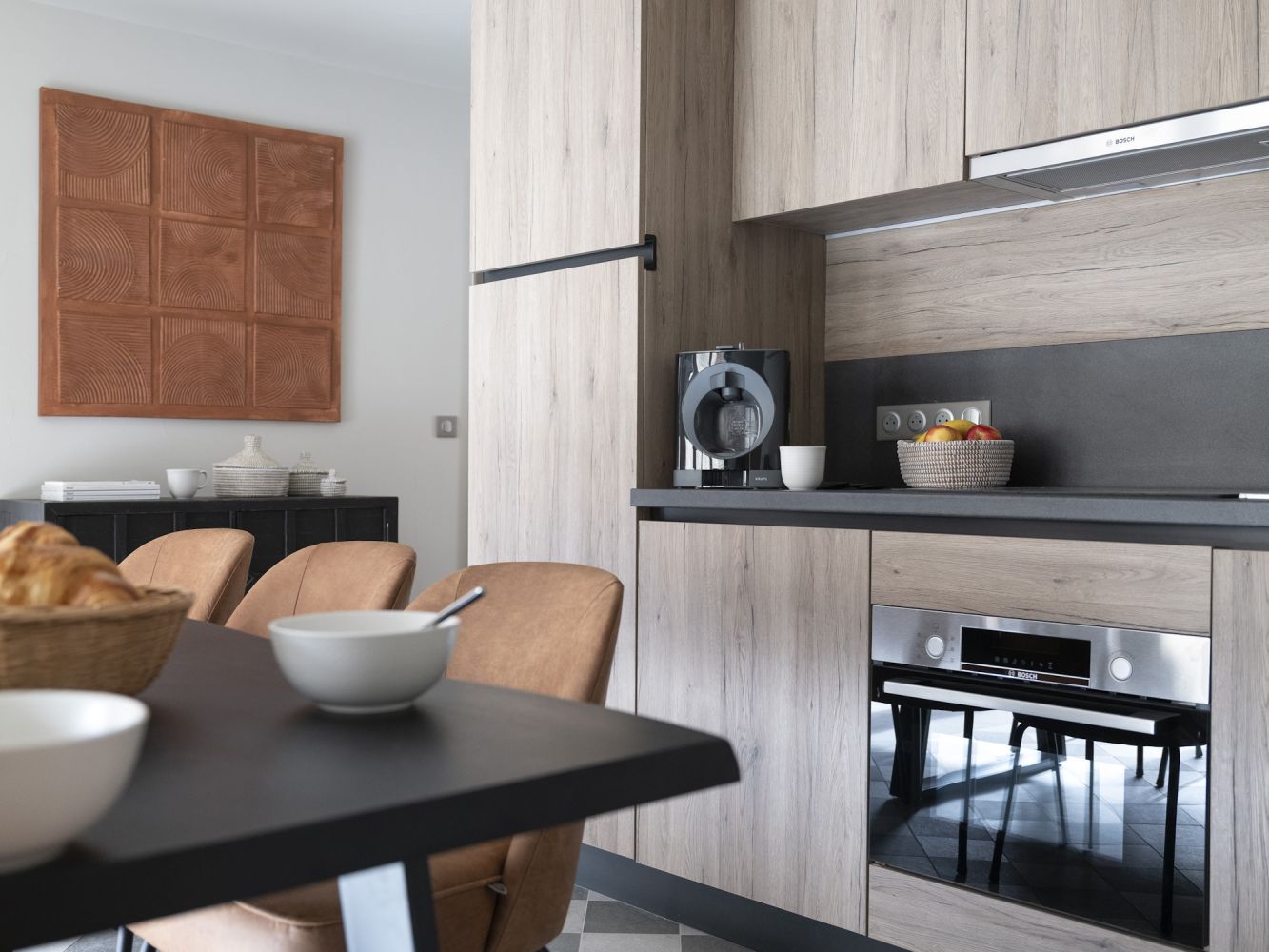 Moderne woonkamer met comfortabele zithoek en televisie. Volledig ingerichte keuken met o.a. keramische kookplaten, koelkast, Nespresso koffiemachine, broodrooster, waterkoker en vaatwasser.