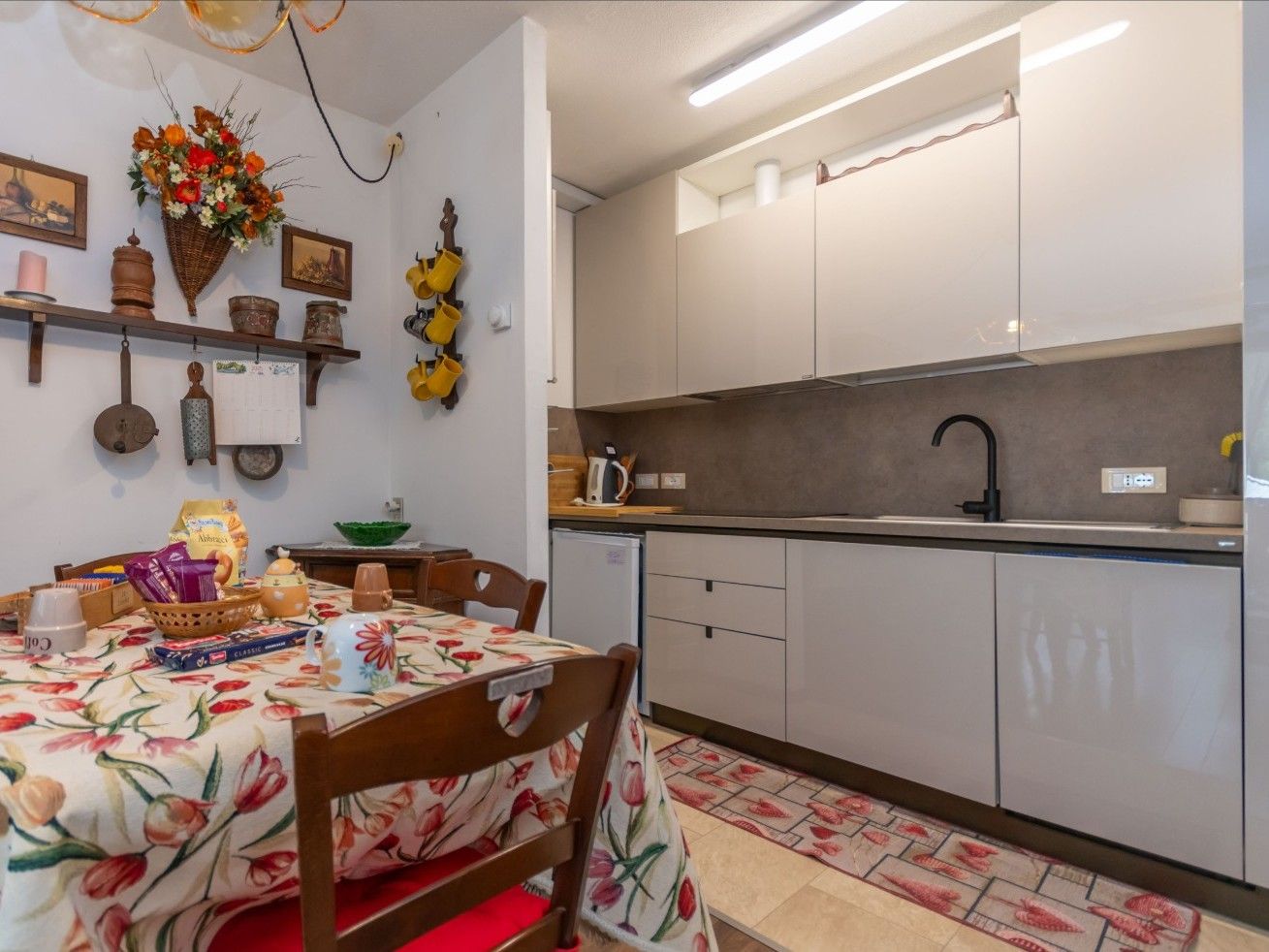 Woonkamer met zithoek met een 2-persoonsslaapbank, televisie en eethoek. Keuken met o.a. 4-pits elektrische kookplaat, koffiezetapparaat, waterkoker, magnetron en koelkast. Er is een balkon aanwezig.