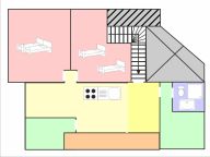 Dit chalet is verdeeld over 3 verdiepingen en een souterrain. Het chalet is opgesplitst in een linker en rechter gedeelte, die alleen via de begane grond en buitenom bereikbaar zijn. Van de negen slaapkamers hebben vijf kamers een 2-persoonsbed en vier kamers twee 1-persoonsbedden.