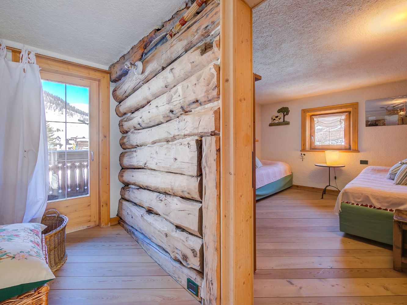 De woonkamer is sfeervol ingericht met veel houten details. Er is een zithoek met bank en televisie en toegang tot het balkon met uitzicht op de skipistes.