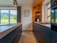 Woonkamer met eethoek en televisie. Volledig ingerichte keuken met o.a. inductie kookplaat, oven, magnetron, vaatwasser, koelkast, koffiezetapparaat en waterkoker.