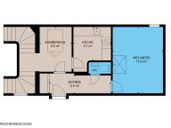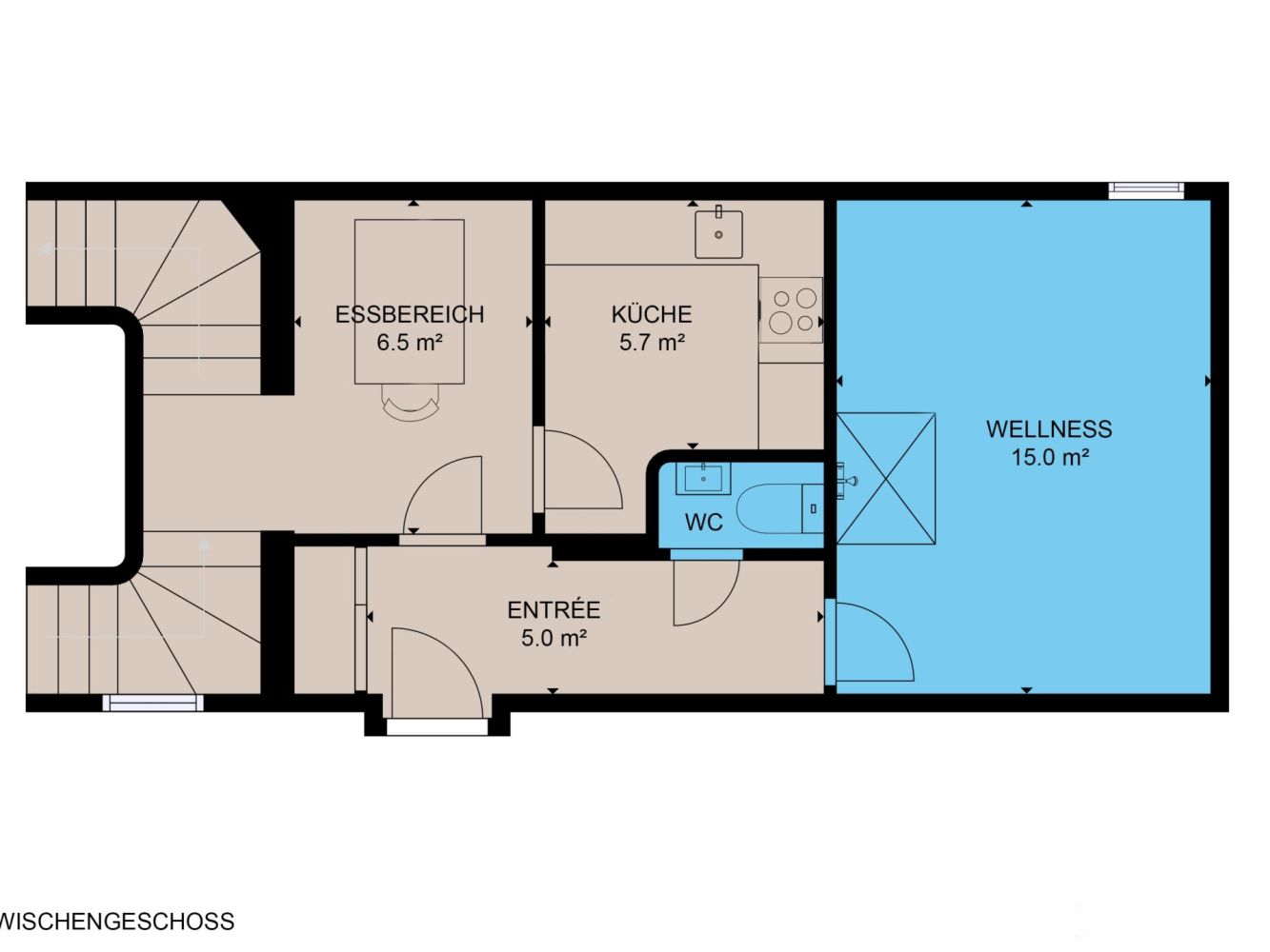 Op de tussen etage is de eetkamer met eettafel. Keuken met o.a. een vier elektrische kookplaten, oven, magnetron, koelkast met vriesgedeelte, broodrooster, waterkoker en koffiezetapparaat (cups). Wellness ruimte met sauna, infraroodsauna en douche. Apart toilet.