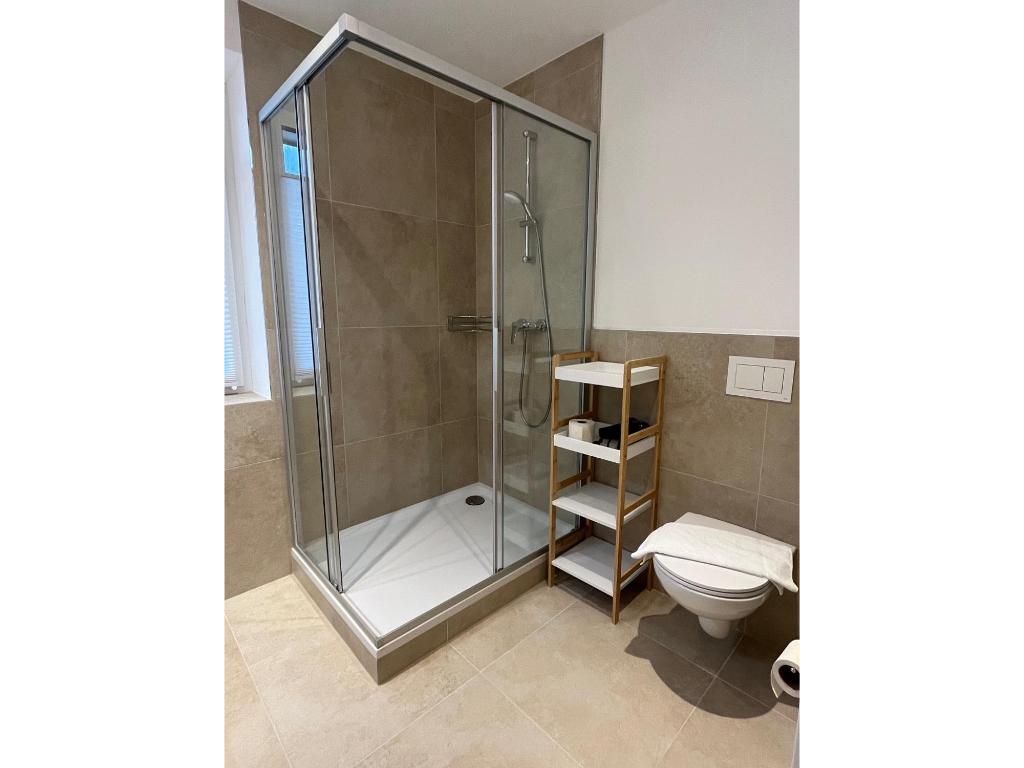 Slaapkamer met een 2-persoonsbed en televisie. Badkamer met douche en toilet.