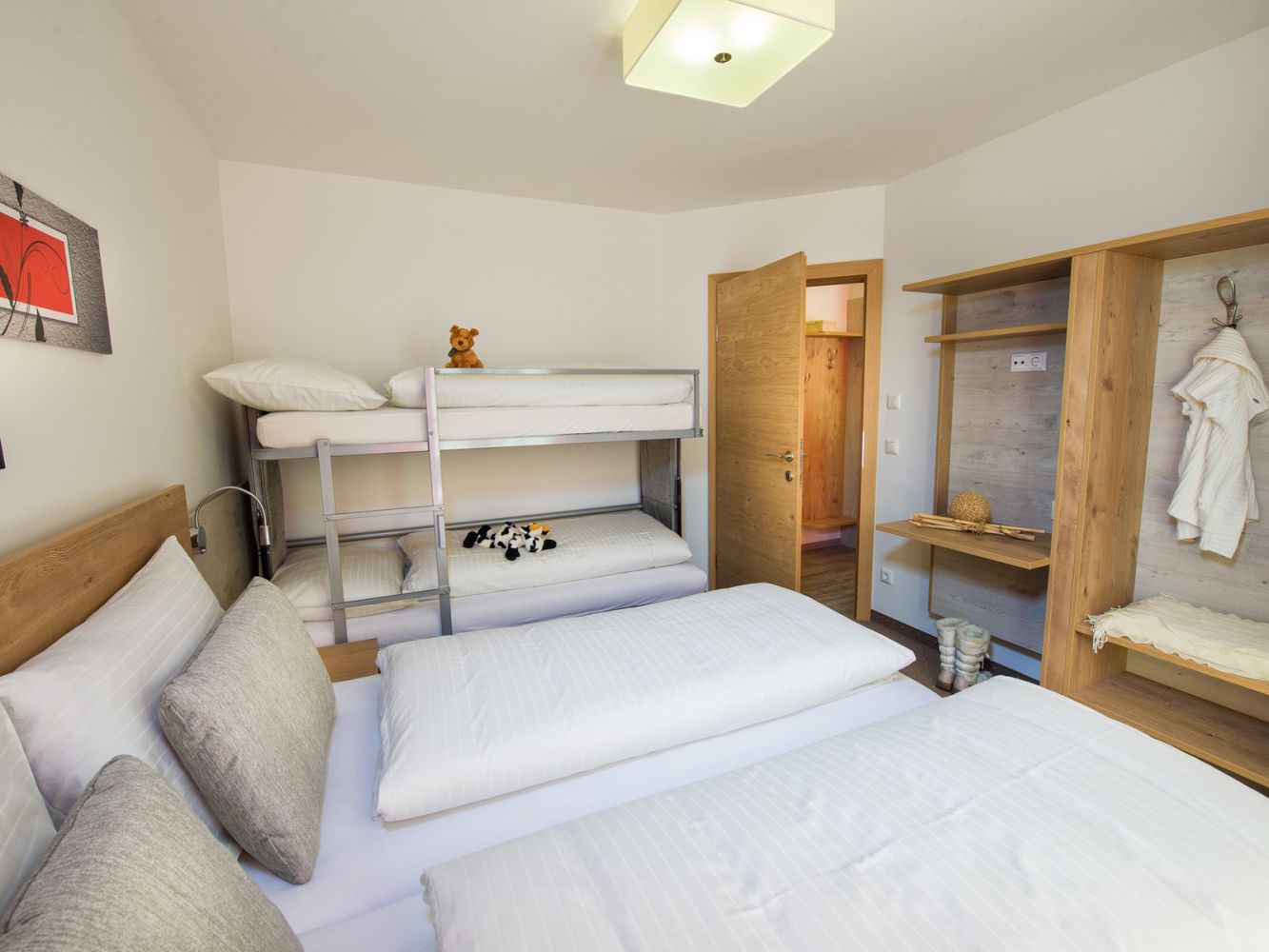 Slaapkamer met een 2-persoonsbed en een stapelbed of een slaapbank. Badkamer met douche en toilet.