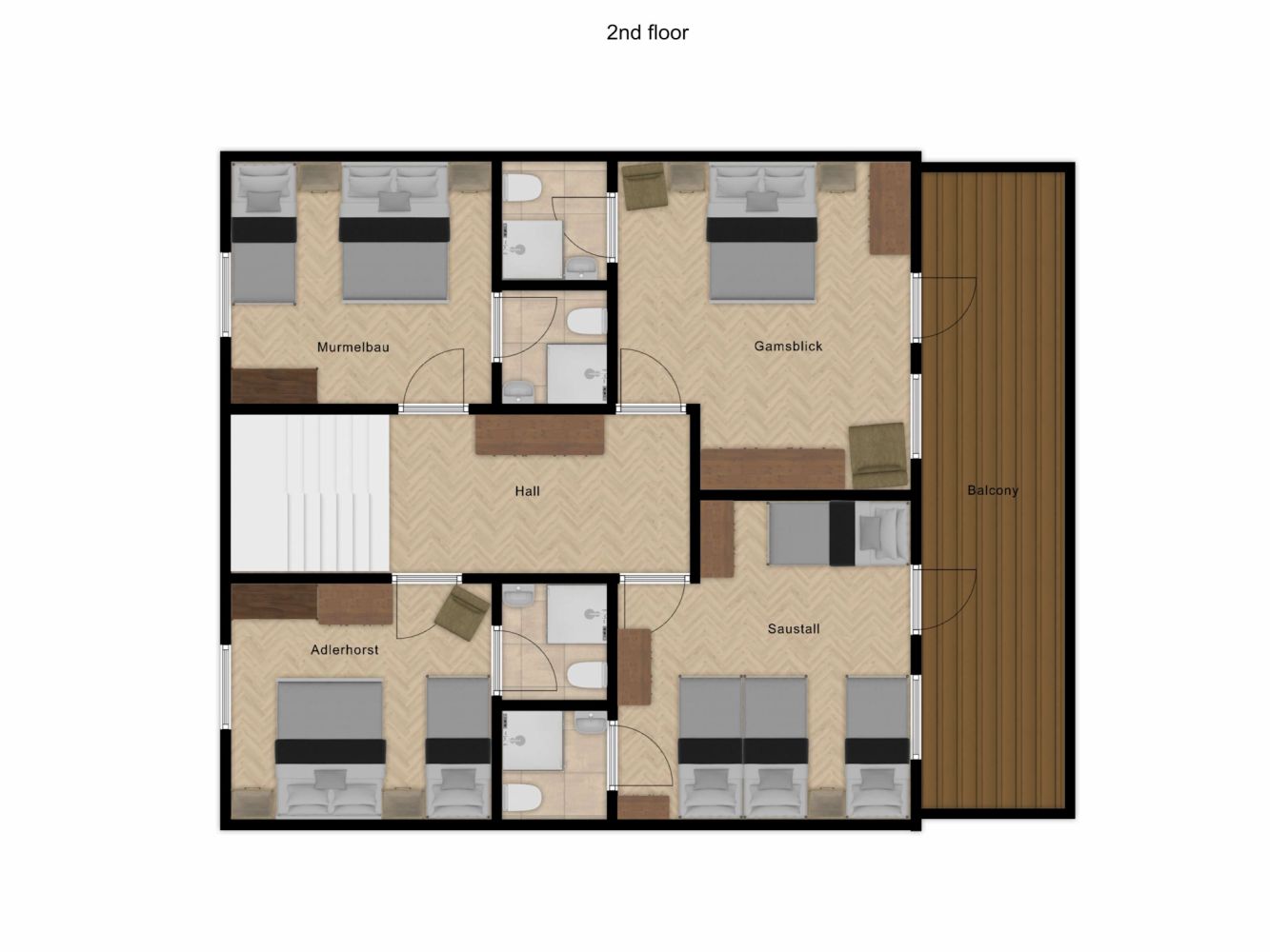 Op de tweede verdieping zijn vier slaapkamers, waarvan twee met een 2-persoonsbed, een 1-persoonsbed en en-suite badkamer met douche en toilet. Eén slaapkamer met een 2-persoonsbed, twee 1-persoonsbedden en een en-suite badkamer met douche en toilet. De vierde slaapkamer heeft een 2-persoonsbed en-suite badkamer met douche en toilet. In deze slaapkamer is de mogelijkheid tot het plaatsen van een extra uitklapbed.