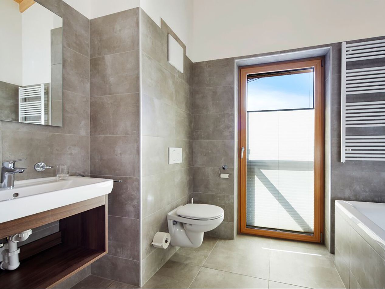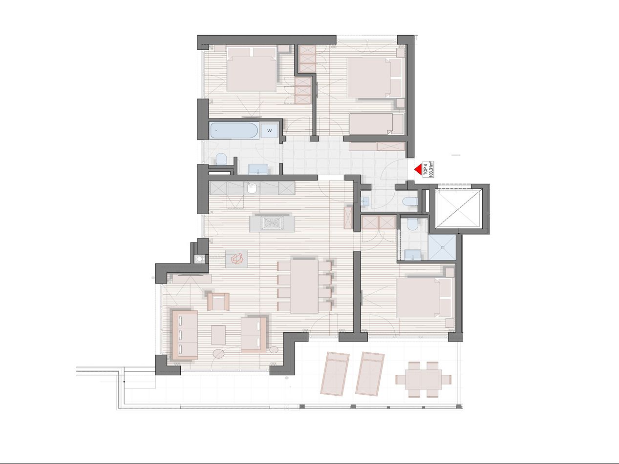 Twee badkamers met bad of douche. Apart toilet. Sommige appartementen beschikken over een derde badkamer met bad of douche.