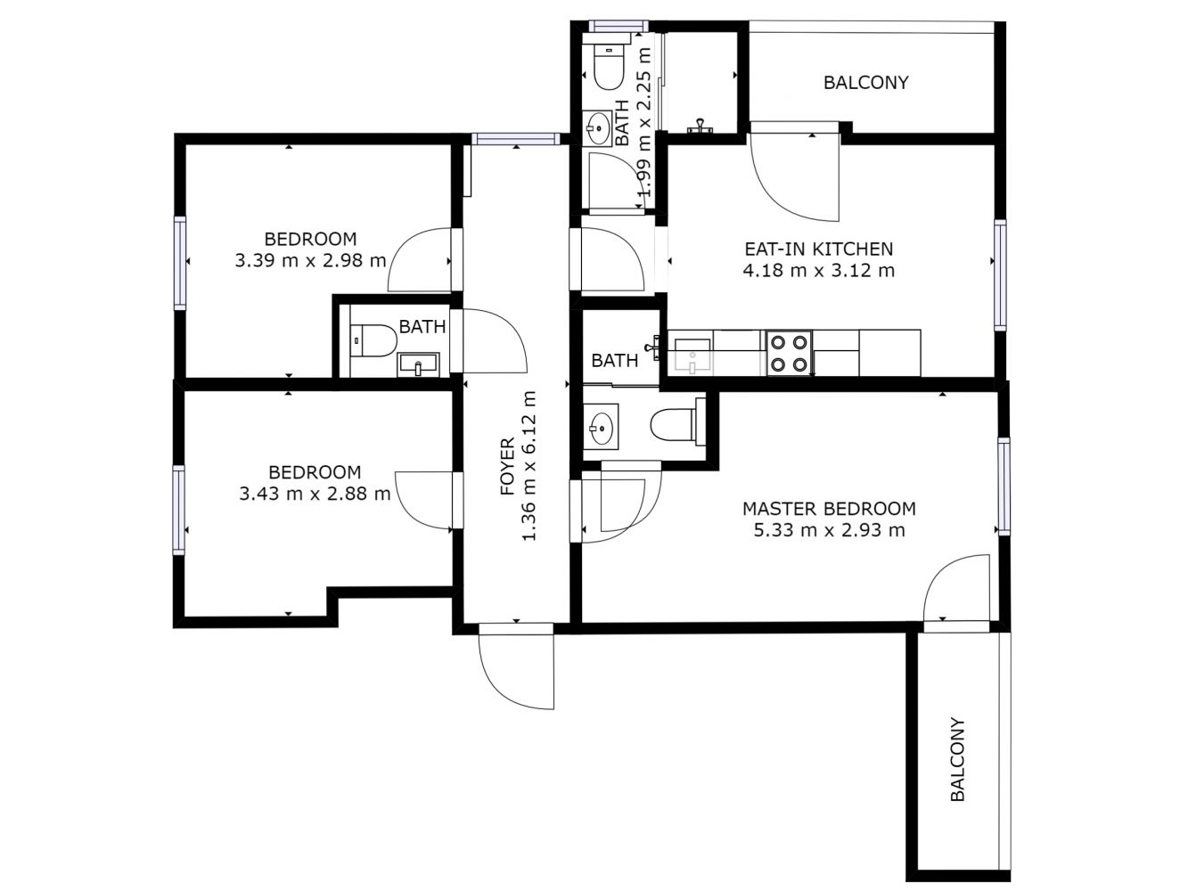 Drie slaapkamers, waarvan twee met ieder een 2-persoonsbed en één met twee 1-persoonsbedden. Twee badkamers met douche en toilet. Apart toilet.