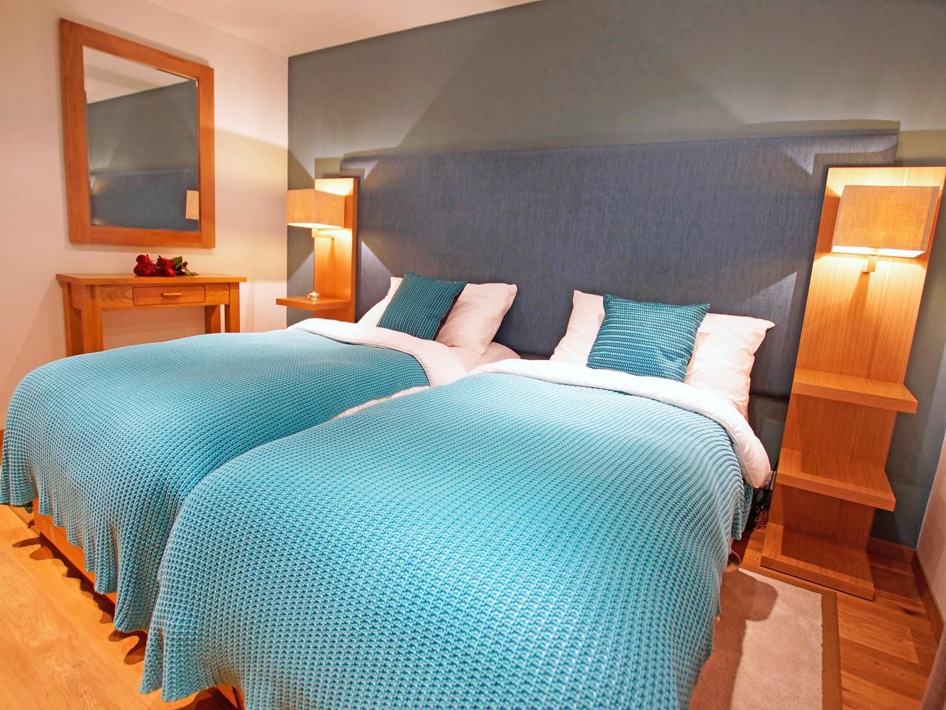 Drie slaapkamers met ieder twee 1-persoonsbedden. Twee badkamers, waarvan één met douche en toilet en één met bad en toilet (één van de badkamers is en-suite met een slaapkamer).